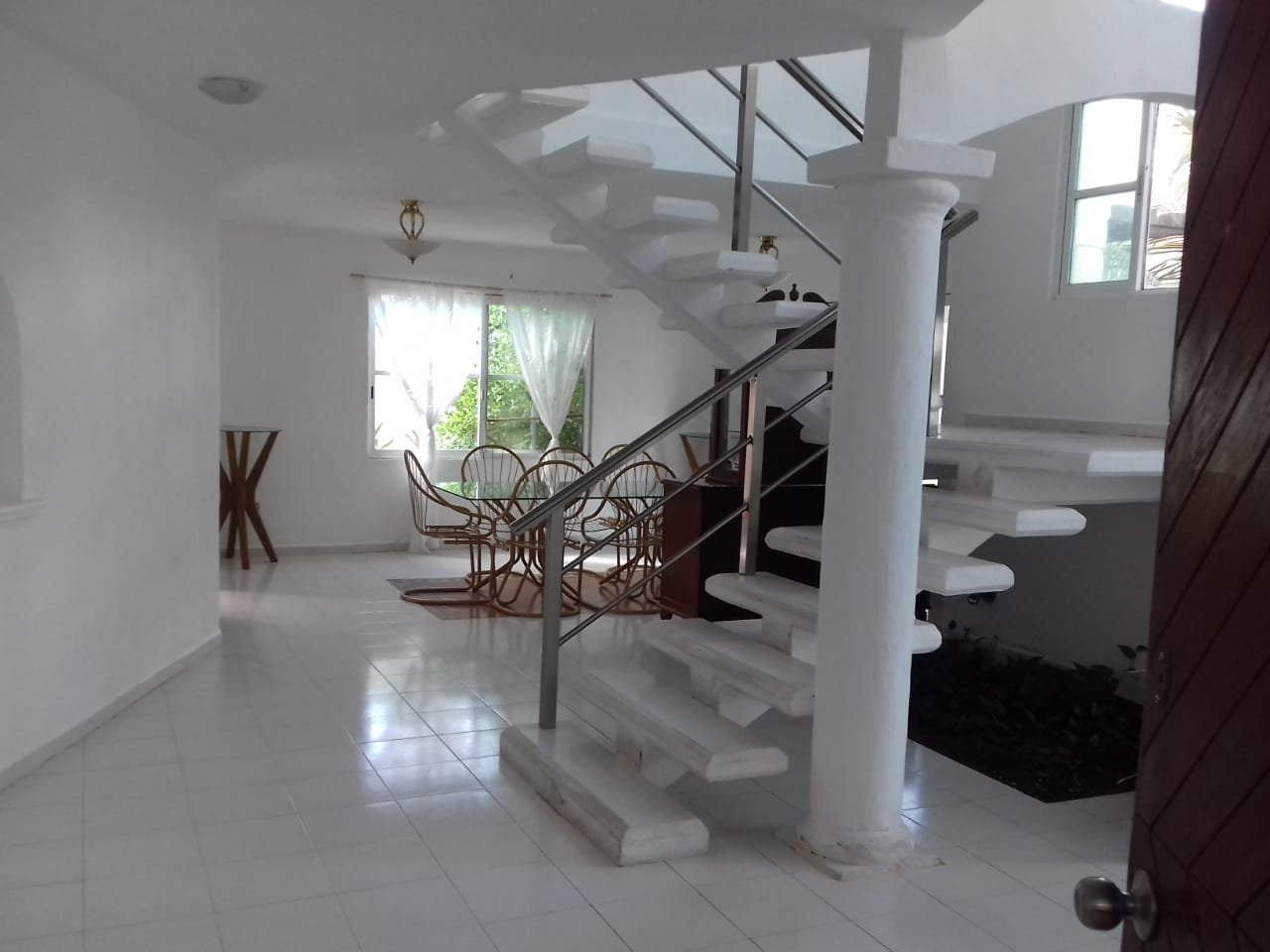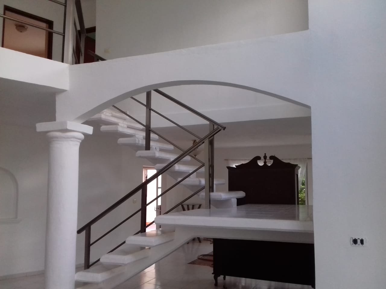 En planta baja cuenta con una recámara que comparte medio baño con la estancia, además de una sala con doble altura, comedor amplio, cocina abierta, área de lavado y bodega.